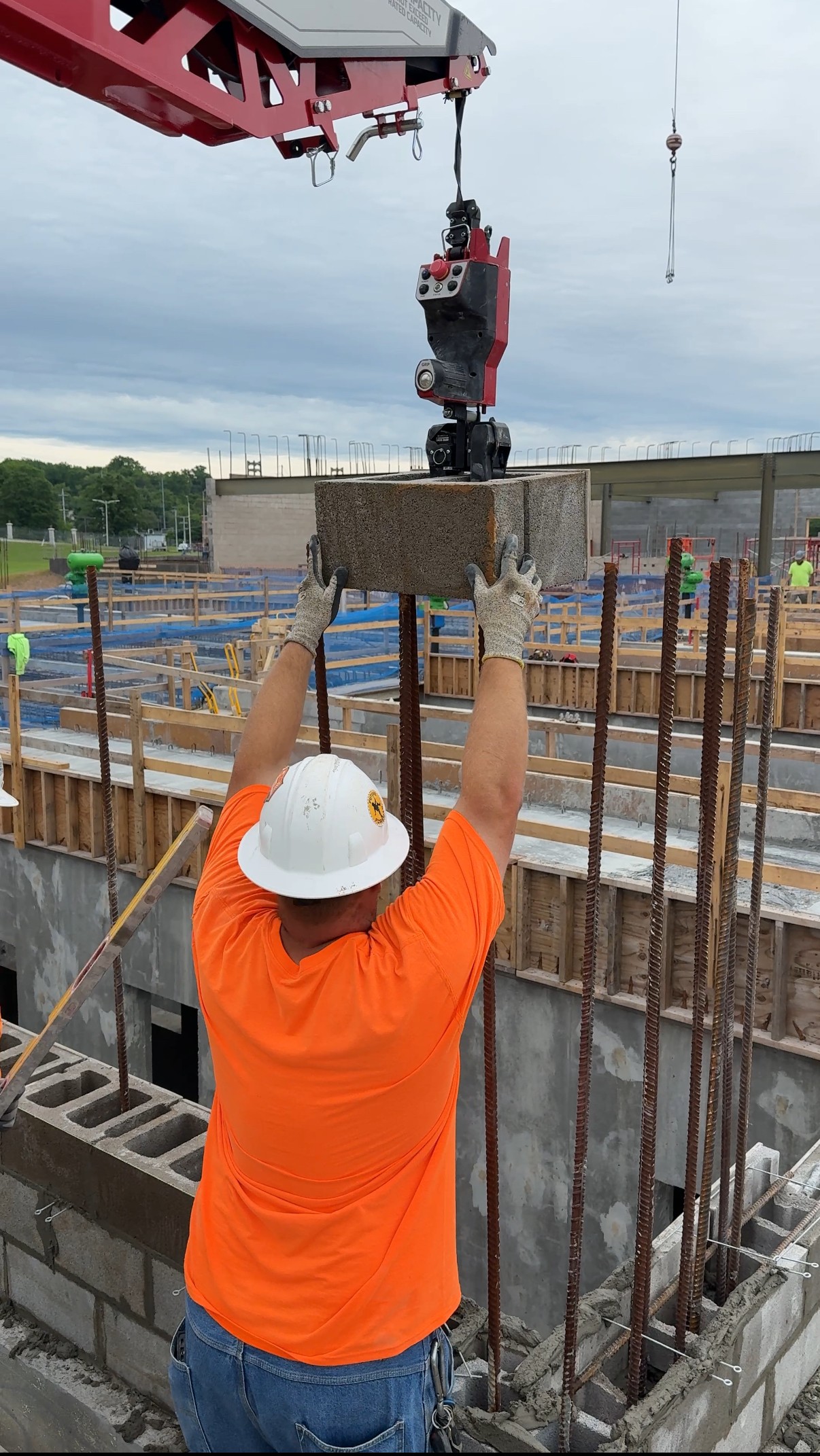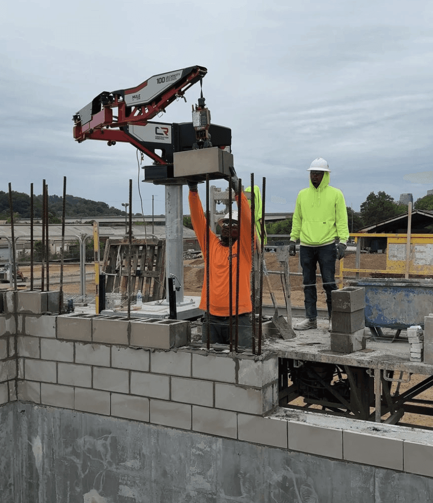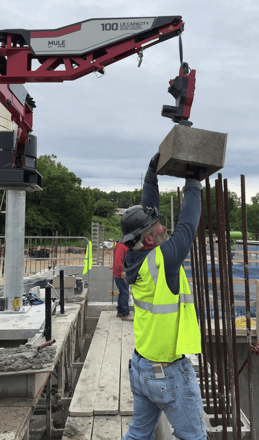 Wasco installs 60lb glazed block over 7ft to 8ft #8 rebar for water treatment facility. The rebar had many areas there were doubled up in every core and the guys were very thankful for having the MULEs to allow them to focus on improving wall quality and not struggling to get the block over and down the rebar. Hydro Mobile 64’ bridge setup. MULEs are spaced extra far to cover the critical areas with the tallest rebar and have the gaps be where windows and lighter block work would be.