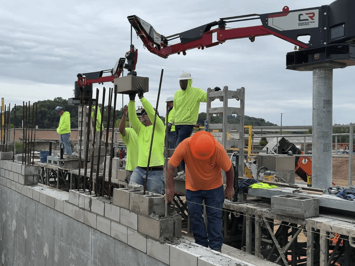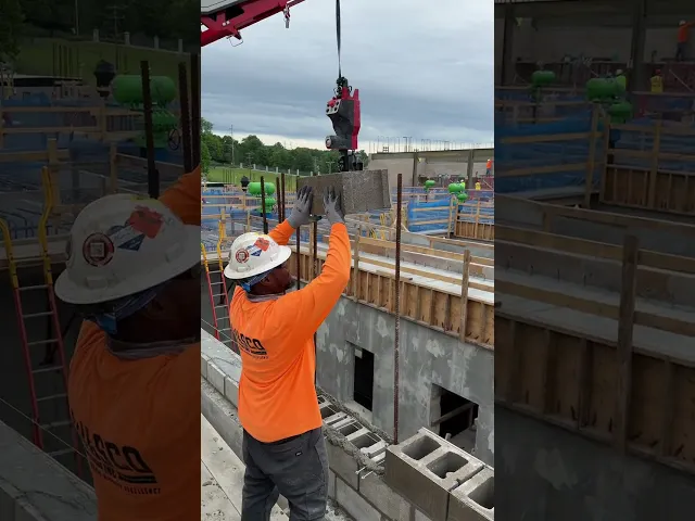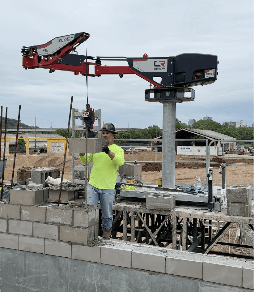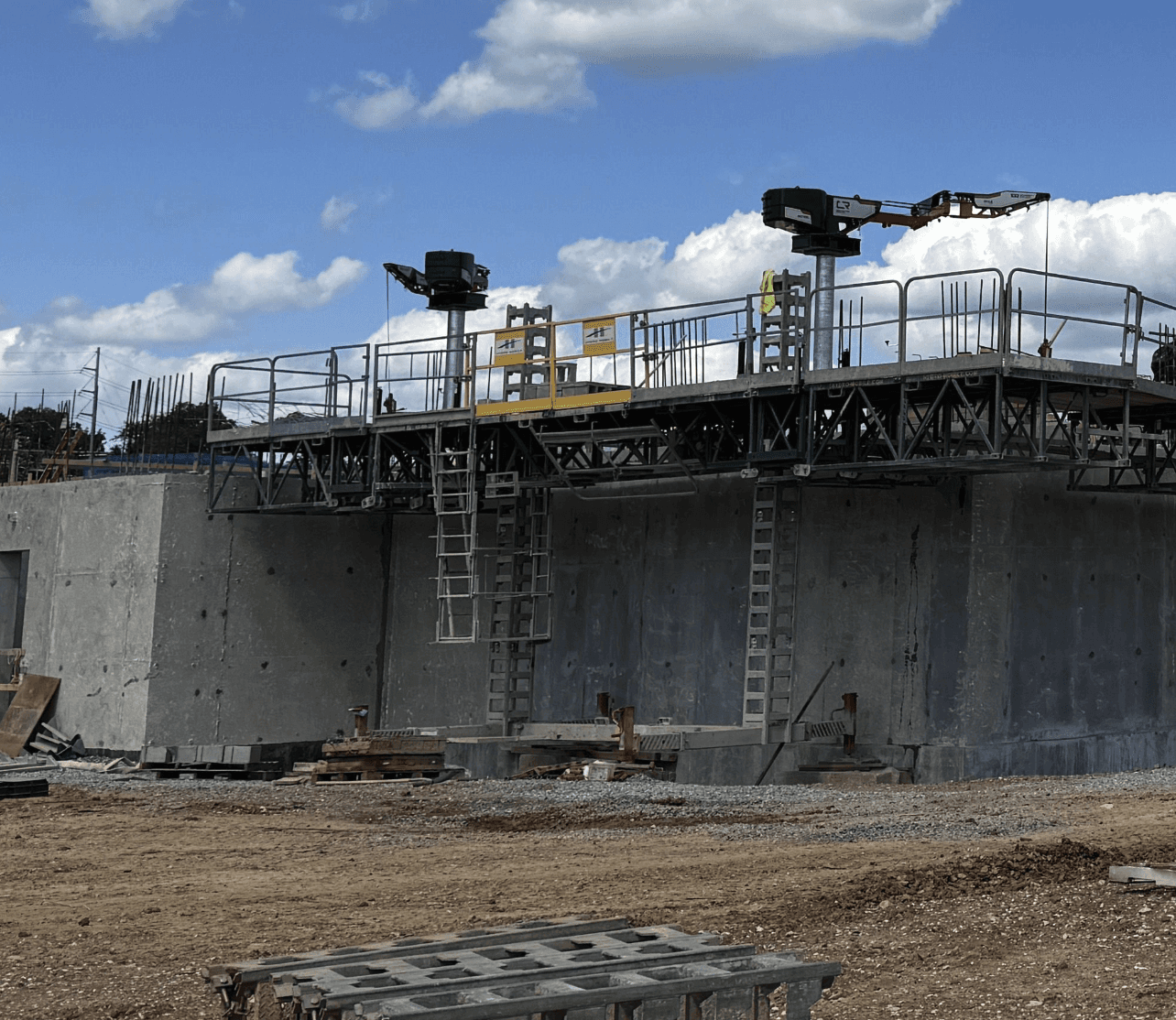 Wasco installs 60lb glazed block over 7ft to 8ft #8 rebar for water treatment facility. The rebar had many areas there were doubled up in every core and the guys were very thankful for having the MULEs to allow them to focus on improving wall quality and not struggling to get the block over and down the rebar. Hydro Mobile 64’ bridge setup. MULEs are spaced extra far to cover the critical areas with the tallest rebar and have the gaps be where windows and lighter block work would be.