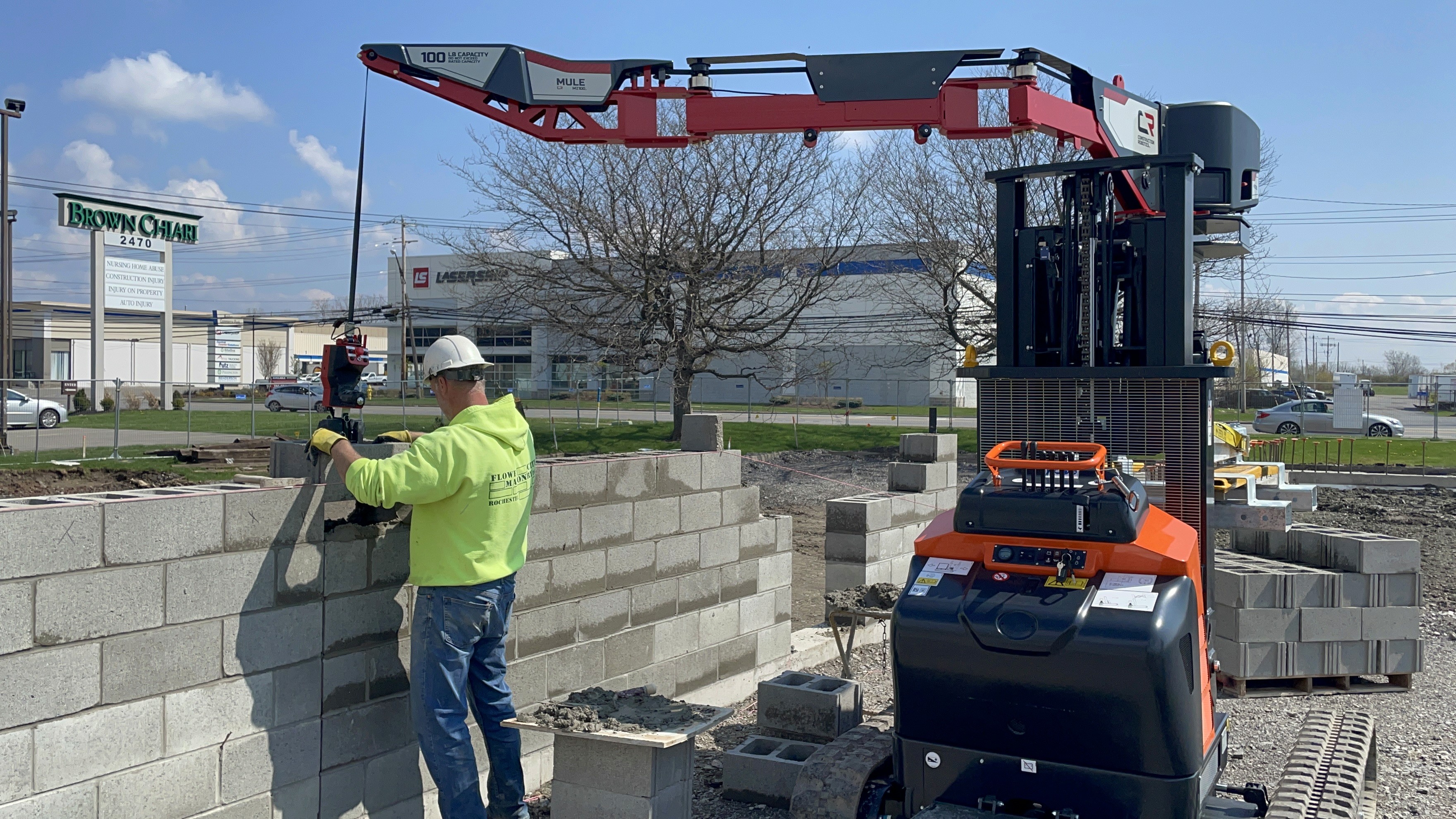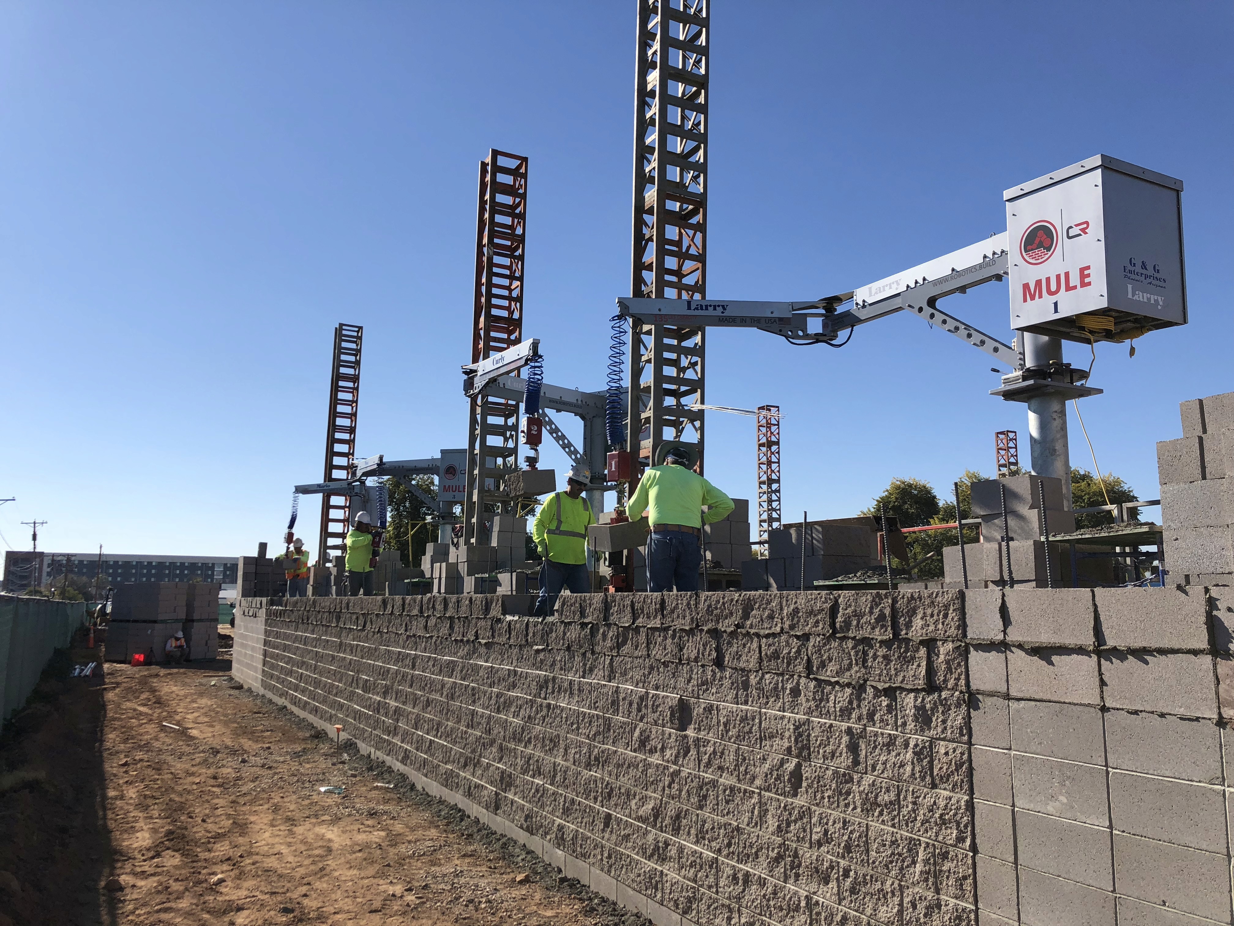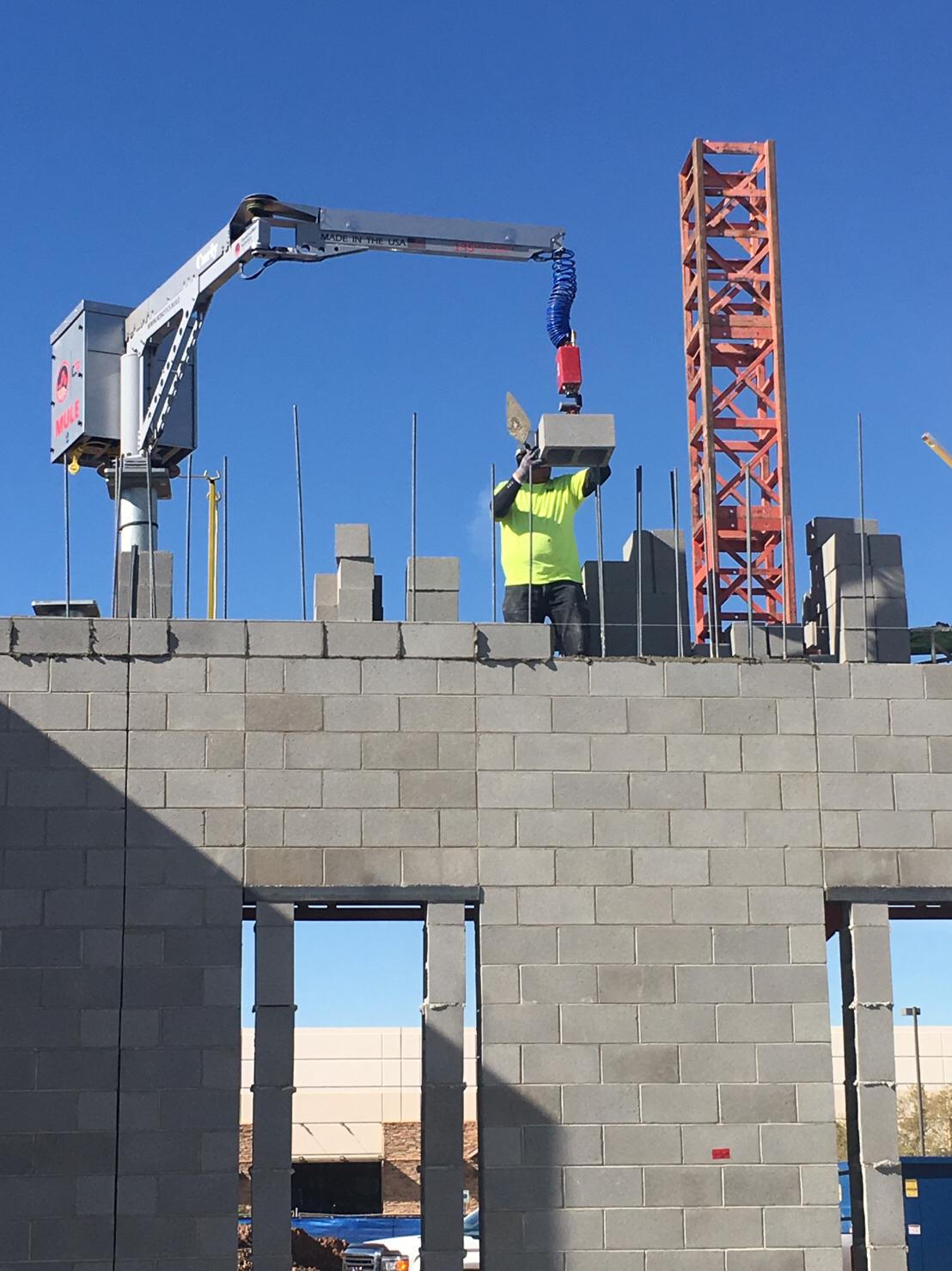 The MULE is a machine that helps lift heavy building materials, like blocks or stones, making them feel weightless so workers can move them easily with their hands, instead of using buttons to lift or lower them like other machines.
